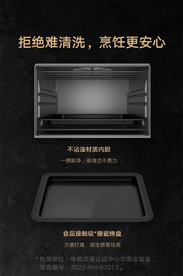米家智能空气炸烤箱 30L 内部采用不沾油内胆,外部配备 NFC 感应区,可一步跳转云端食谱。米家智能空气炸烤箱 30L 支持小爱同学语音操控,配备 1.32 英寸 OLED 旋钮屏与两颗触控键。