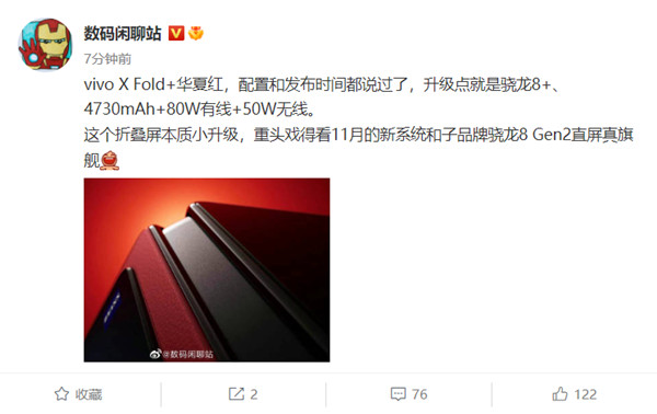 据数码博主 @数码闲聊站 今日透露,贾净东在工作笔记中的配图即为 vivo X Fold + 折叠屏手机新增的华夏红配色。从图片中可以看出,华夏红配色的 vivo X Fold + 折叠屏手机采用黑红搭配设计,较为注重质感。同时,vivo 将在 11 月发布新系统,并且 vivo 子品牌 iQOO 也将在 11 月发布搭载骁龙 8 Gen 2 的直屏旗舰。