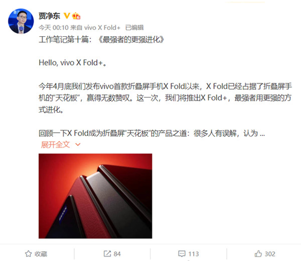 9 月 19 日消息,今年 4 月,vivo 推出了 vivo X Fold 折叠屏手机,售价 8999 元起。近日, vivo X Fold 迭代产品 ——vivo X Fold + 折叠屏手机已经现身工信部,并且有消息称该机将于本月底发布。今日,vivo 品牌副总裁,兼品牌与产品战略总经理贾净东在社交平台上发布的 vivo X Fold + 工作笔记,确认了这一消息。