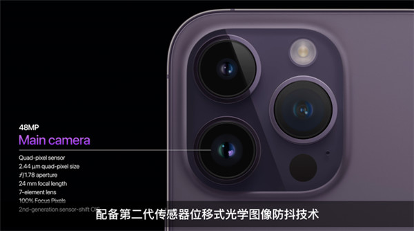 苹果 iPhone 14 Pro 系列全新搭载了 4800 万像素的广角主摄,支持四合一像素技术,24 毫米焦距,/1.78 光圈,还有第二代传感器位移式光学图像防抖功能。同时还搭载了全新 1200 万像素超广角摄像头(单位像素大小为 1.4 微米)。