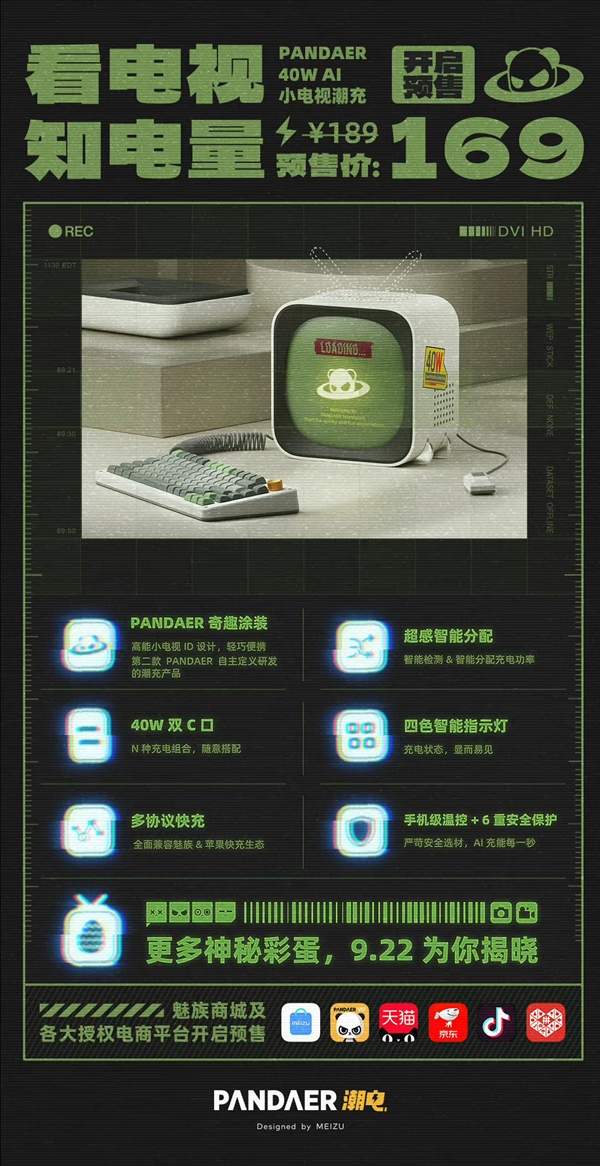 魅族此前官宣的PANDAER 40W AI 小电视潮充正式上架了,预售169元。