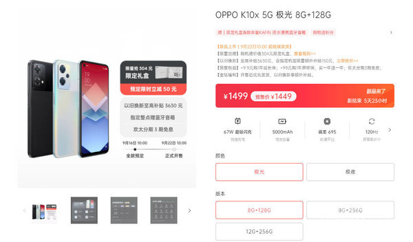 9月16日,OPPO千元档新机OPPO K10x正式上市!新机共提供极光、极夜两种配色,8GB+128GB版、8GB+256GB版、12GB+256GB版三种内存版本,分别售价1499元、1699元、1999元,预定限时立减50元,到手价1449元起,将于9月22日10:00起陆续发货。购机送价值304元限定礼盒(内含OPPO Enco Air2i真无线耳机、乔威充电宝、爱酷者手机支架),限量110个。