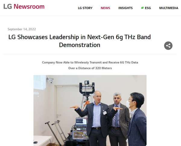 9 月 15 日消息,9 月 14 日,LG 官方宣布成功测试了 155 至 175 GHz 频率范围内 6G 太赫兹 (THz) 数据的无线传输和接收,户外距离可达 320 米。