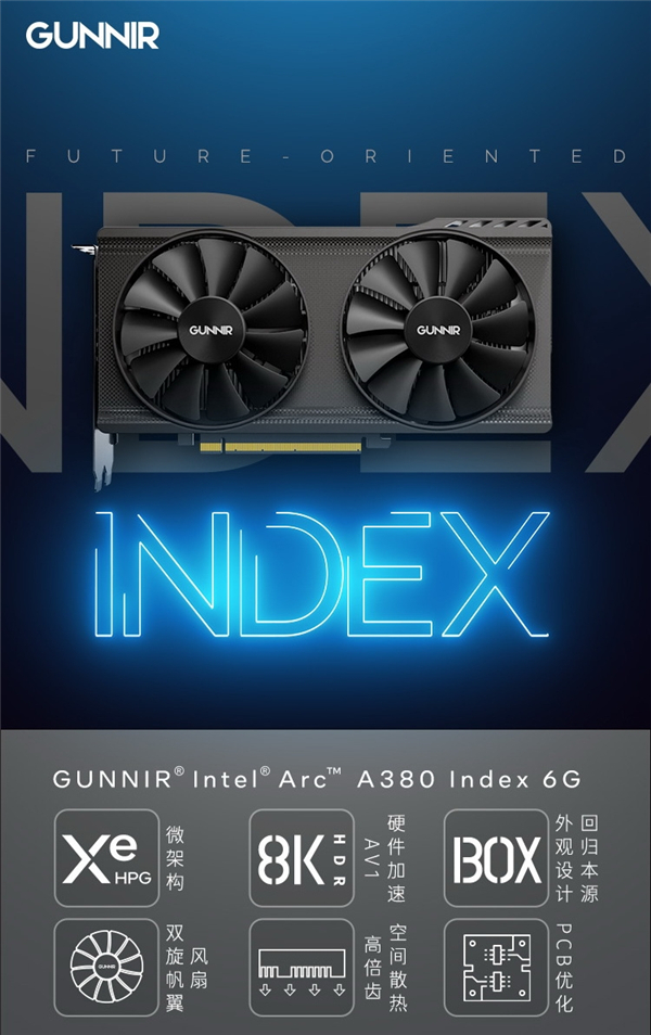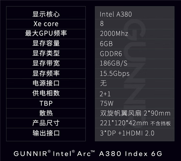 第二款型号为Arc A380 Index,核心频率降至公版标准的2000MHz,功耗也来到75W,不再需要辅助供电,但也注定无法超频。