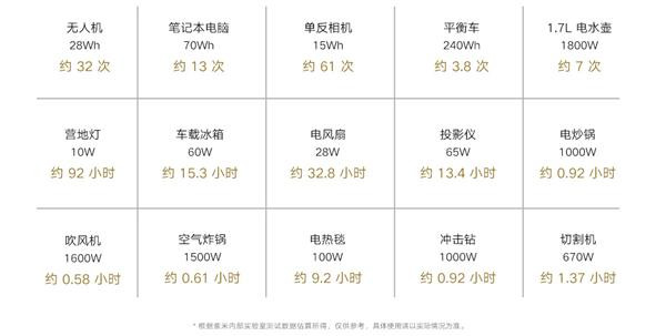 米家户外电源 1000 Pro 内置 280000mAh / 1022Wh 大容量电芯,1 度电量长续航。搭载双向逆变闪充技术,只需一根标配充电线即可快速自充,50 分钟最快补电 80%,1.5 小时充电 100%。官方提供的数据显示,它能够为无人机(28Wh)充电约 32 次、笔记本电脑(70Wh)约 13 次、单反相机(15Wh)约 61 次、营地灯(10W)约 92 小时、车载冰箱(60W)约 15.3 小时等等。