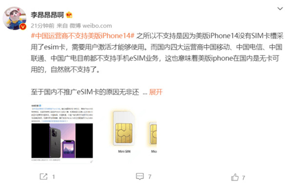 今日,数码博主@李昂昂昂啊发文表示,中国运营商不支持美版iPhone14,之所以不支持是因为美版iPhone14没有SIM卡槽采用了esim卡,需要用户激活才能够使用。而国内四大运营商中国移动、中国电信、中国联通、中国广电目前都不支持手机eSIM业务,这也意味着美版iphone在国内是无卡可用的,自然就不支持了。