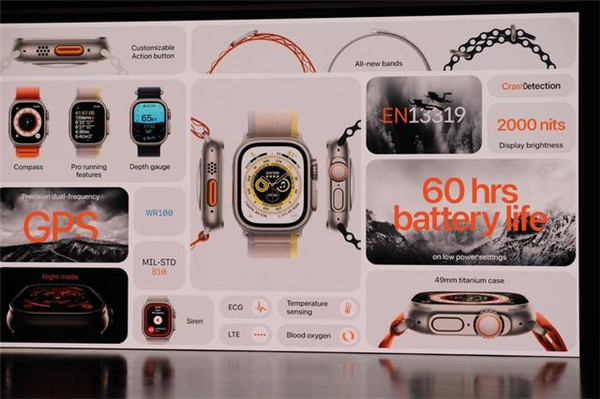 Apple 今日宣布推出 Apple Watch Ultra,采用大胆的全新设计,并新增为耐力型运动、野外探索与冒险活动打造的多种功能。Apple Watch Ultra 采用 49 毫米钛金属表壳与平面蓝宝石玻璃表镜,配备迄今面积最大、亮度最高的 Apple Watch 显示屏。可自定义的操作按钮方便用户快捷使用多种实用功能。Apple Watch Ultra 拥有所有 Apple Watch 中最出色的电池续航表现,在正常使用条件下最长可达 36 小时。此外,通过全新的低功耗设置,电池续航时间更可延长至最高 60 小时,适合连续多日佩戴使用。专为 Apple Watch Ultra 大面积显示屏设计的“寻路者”表盘包括融入时间显示区域的指南针,并提供了可容纳多达 8 项复杂功能的空间。Apple Watch Ultra 同时带来 3 款新表带:野径回环式表带、高山回环式表带和海洋表带,分别以独特设计为每一场冒险提供安全舒适的佩戴体验。