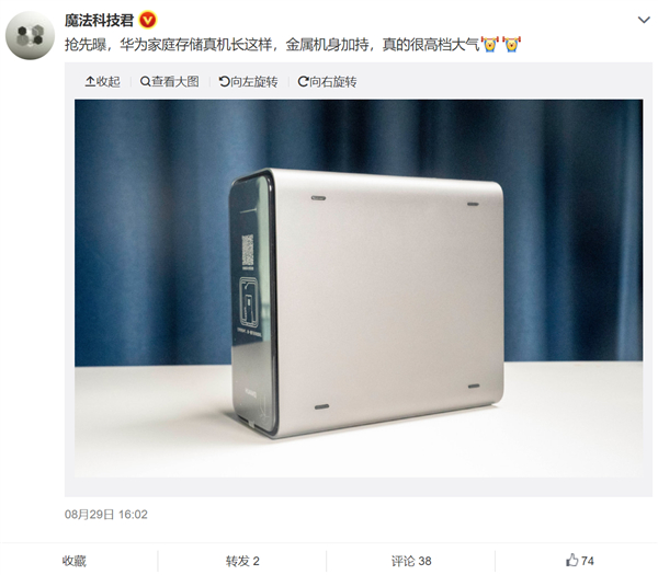 另外,数码博主“魔法科技君”更是提前将华为家庭存储真机照公布,新品采用金属机身设计,机箱正面附有安装指导、使用指南二维码、打开手机NFC,碰一碰开启体验的提示贴纸,下方则为“HUAWEI”Logo。