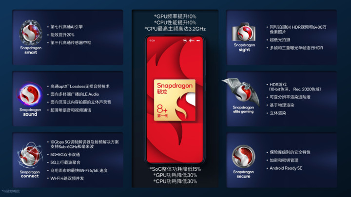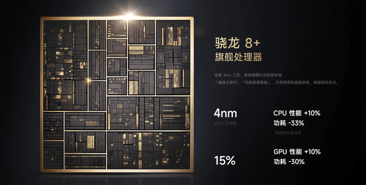 骁龙 8+ 移动平台采用了 4nm 的先进工艺制程,有着更加突出的能效比,三丛集架构的 CPU 每个核心都有了频率提升,带来了 10% 的性能提升。