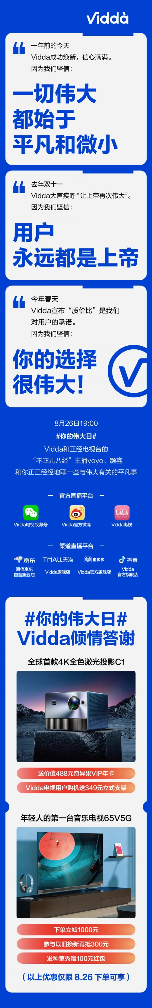 8月26日作为Vidda品牌焕新一周年纪念日,又被网友称为#你的伟大日#。源于Vidda在去年双十一时对行业大声疾呼“用户就应该是上帝”,“让上帝再次伟大”。互联网时代,用户不应该被当做品牌的粉丝,品牌也不应该高高在上。一切伟大,都源于平凡和微小,每一位平凡人都有自己的伟大。