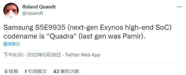此前爆料人士 Roland Quandt 称,三星已将其下一代旗舰 Exynos 芯片的内部代号设置为“Quadra”。Exynos 2200 的代号是 Pamir,预计使用 3nm GAA 制程工艺,并拥有最新的 ARM CPU 内核和基于 AMD 新 Radeon GPU 的更新 Xclipse GPU。 3nm 芯片组的量产预计将于今年晚些时候开始,与下一代 Exynos 处理器完美同步。