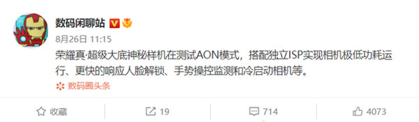据微博博主 @数码闲聊站 透露,荣耀真超级大底神秘样机正在测试 AON 模式,搭配独立 ISP 可实现相机极低功耗运行、更快的响应人脸解锁、手势操控监测和冷启动相机等。