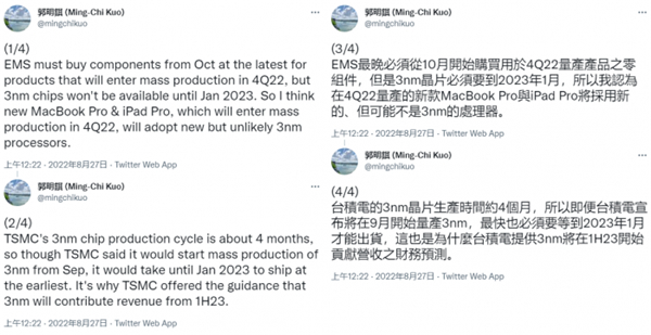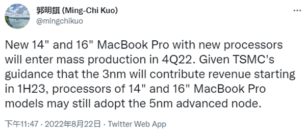 在周五的一系列推文中,人脉深厚的苹果分析师郭明錤表示,即将推出的 2022 款 MacBook Pro,或无法及时用上台积电 3nm 芯片。本周早些时候,他曾提到搭载 5nm 新处理器的 14 / 16 英寸 MacBook Pro 将于 2022 年 4 季度转入量产,而 3nm 芯片将于 2023 上半年为台积电贡献可观的营收。