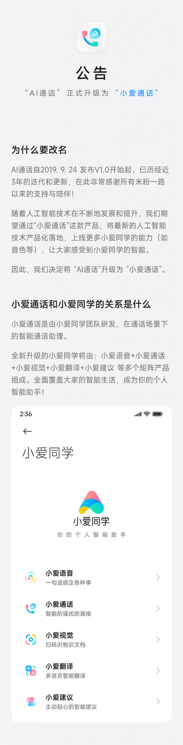 小米发布公告,宣布“AI 通话”正式升级为“小爱通话”。