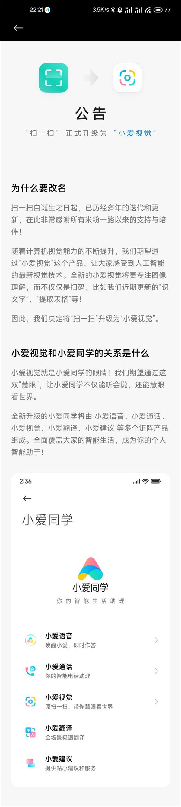 1. 今天将迎来里程碑的一刻,【扫一扫】将正式改名升级为【小爱视觉】,原来的扫码和识物功能也合并简化为扫一扫。版本号为 V15.0.0。