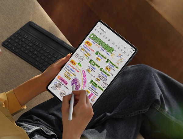 外观方面,华为的这款新平板非常具有高端感和设计感。其背面并无太多的花纹,设计点主要集中在摄像头上,这款华为平板的摄像头,据说和华为即将发布的Mate 50系列是同款设计。而该平板正面的屏占比非常高,屏幕右上角还有一个开孔,用来放置前置摄像头。