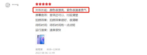 OPPO Reno8花仙紫配色,该机拥有超高的颜值外观,应该年度最具时尚潮流的一款手机,拥有夜游黑、微醺和新配色的花仙紫(鸢尾紫),均得到了用户的一致好评。比如OPPO Reno8 的花仙紫配色,以淡紫色的花影叠层工艺和立体的花瓣纹理铺面,彰显出了轻奢的质感,尽显优雅和浪漫。比如有一位用户收到手机之后,给出了“颜色很漂亮”、“紫色很温柔贵气”的评价,可见这款新机的外观设计得到了用户的认可。