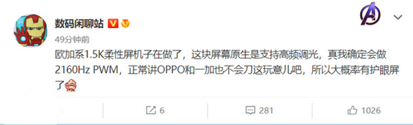 据微博博主 @数码闲聊站 称,OPPO 一加系也将推出 1.5K 柔性屏手机,该屏幕原生支持高频调光,realme 真我新手机将支持 2160Hz PWM,OPPO 和一加应该也不会砍掉,所以大概率有护眼屏。