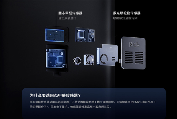 同时,净化器搭载瑞士原装进口固态甲醛传感器,得益于固态电子技术,传感器分辨率高至小数点后三位。
