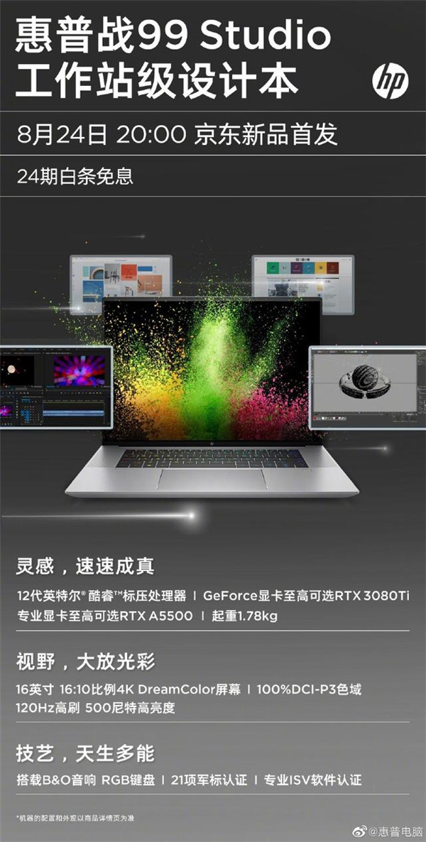 惠普官网发布,惠普将于 8 月 24 日首发战99 Studio高性能设计本,搭载 12 代酷睿,可选 RTX 3080 Ti 或 RTX A5500 专业卡。