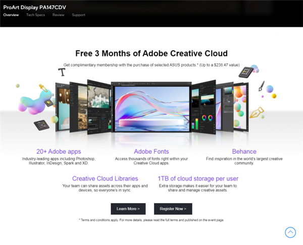 在特定地区选购 ProArt Display PA147CDV 的客户,还可享用为期三个月的 Adobe CC 订阅(价值 237.47 美元)。