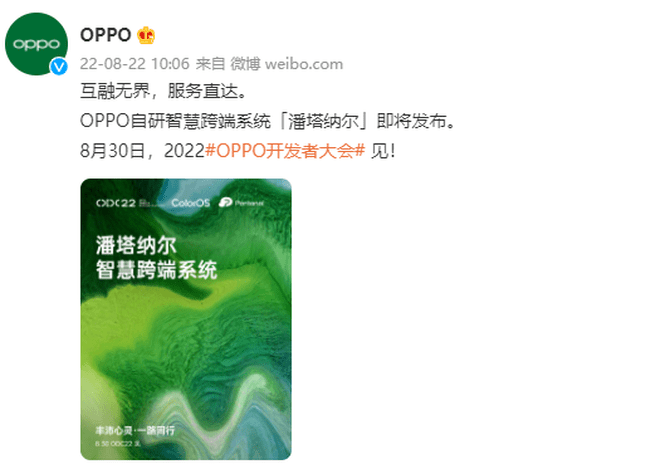 OPPO官宣,首个自研跨端系统“潘塔纳尔”会在8月30日的2022 OPPO 开发者大会上发布,现场将会详细介绍这款系统的功能和使用方法。