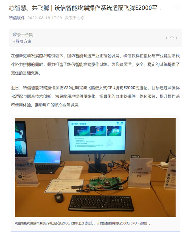 8 月 22 日消息,据统信软件发布,近日,统信智能终端操作系统 V20 近期完成飞腾嵌入式 CPU 腾珑 E2000 的适配,统信智能终端操作系统 V20 已经在 E2000 开发板上成功运行,开发板搭载腾珑 E2000Q CPU(四核)。