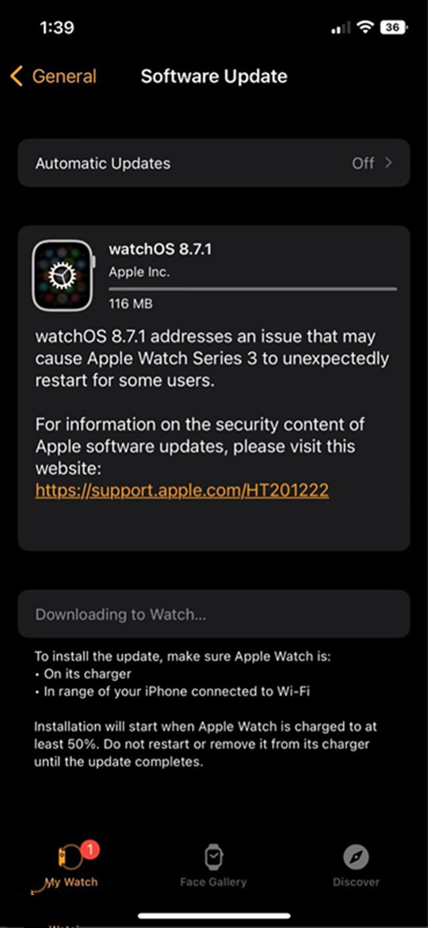 本次 watchOS 8.7.1 更新仅适用于 Apple Watch Series 3 机型,拥有更新 Apple Watch 的用户将不会检查到此更新。