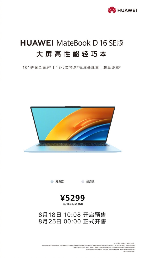 8月18日消息,华为终端官方微博宣布,华为MateBook D 16 SE版将于今日上午10:08开启预售,售价5299元,将于8月25日正式开售。