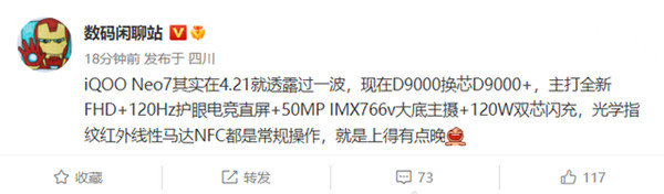 据数码博主 @数码闲聊站今日爆料,iQOO Neo7 的处理器从之前的天玑 9000 换为了天玑 9000+,将主打全新的 FHD + 分辨率 120Hz 刷新率的护眼电竞直屏、50MP IMX766V 大底主摄、以及 120W 双电芯快充。此外,该机还将配备光学指纹识别、线性马达、NFC 和红外遥控功能。