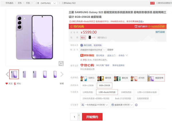 值得注意的是,除了幽紫秘境之外,三星Galaxy S22还有羽梦白、曜夜黑、雾松绿和浮光粉等配色可供选择。