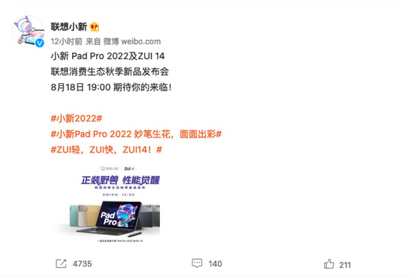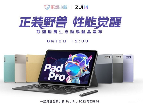 联想小新官方今天宣布,小新Pad Pro 2022平板和ZUI 14系统将在8月18日的联想消费生态秋季新品发布会上亮相。