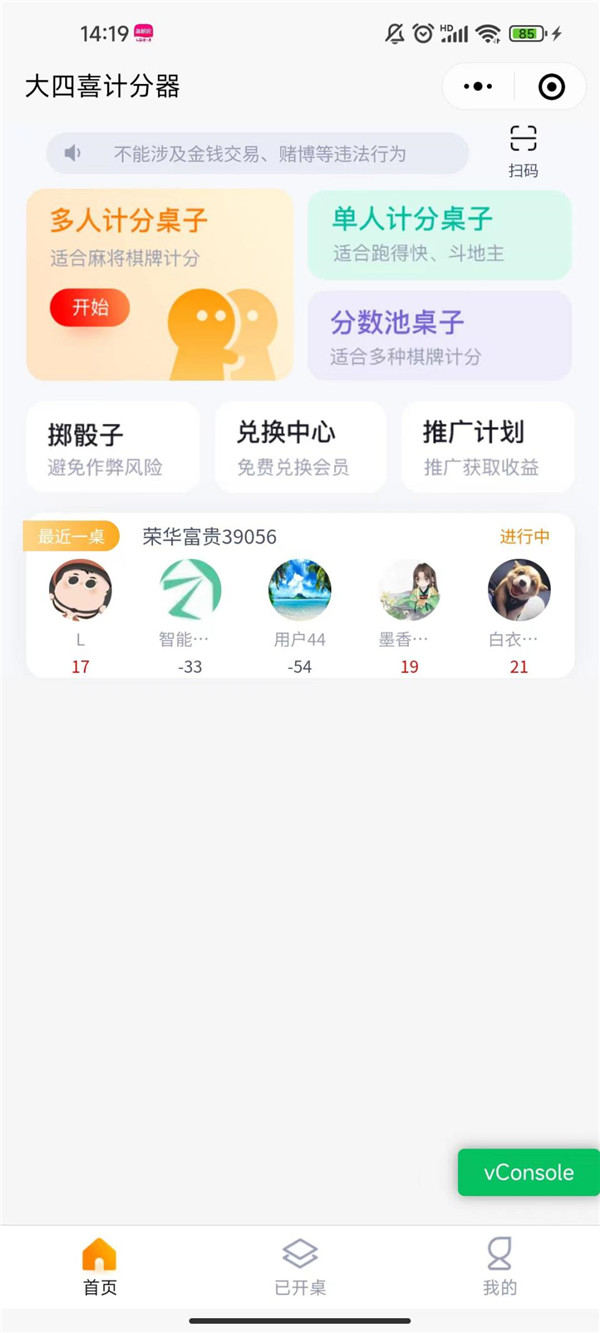 首先我们打开大四喜计分器,登录成功后进入这样的页面: