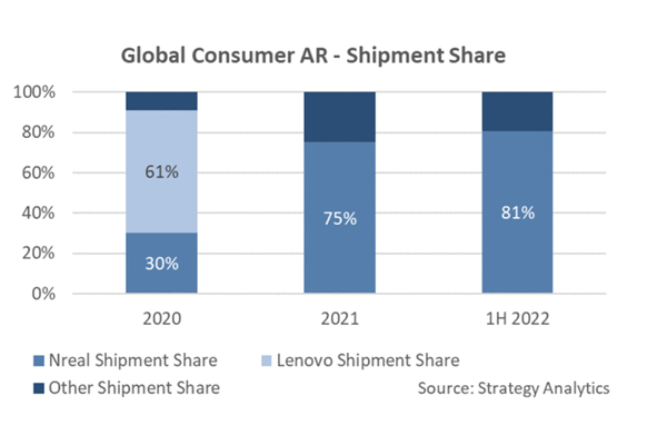 根据国际知名市场研究机构Strategy Analytics最新报告,2026年Nreal在消费级AR市场份额达到了75%,2022年上半年这一数据升至81%,在全球占据领先地位。