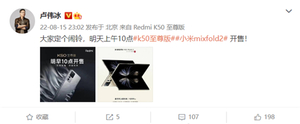 8月15日晚11点多,卢伟冰还在微博发文为新机的首销预热,提醒大家明早记得定个闹钟,自家新机Redmi K50至尊版,以及小米MIX Fold 2都将在今天上午十点首销。