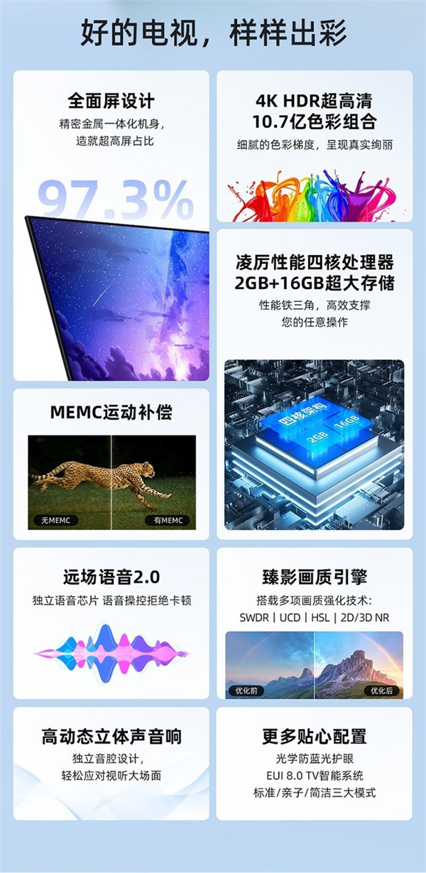 据了解,乐视超级电视F65Pro是其下半年主打的一款高性价比新品,拥有4KHDR超高清、凌厉性能组合、MEMC运动补偿、远场语音2.0等多个主打卖点,同时,电视的全面屏设计、高动态立体声音响、多项画质强化技术、四核处理器、2GB+16GB超大存储、光学防蓝光护眼、EUI8.0TV智能系统还搭载了标准、亲子、简洁三种个性化使用模式,同时,它更是拥有10.7亿色彩的细腻色彩梯度,能为用户呈现真实又绚丽的影像画面。