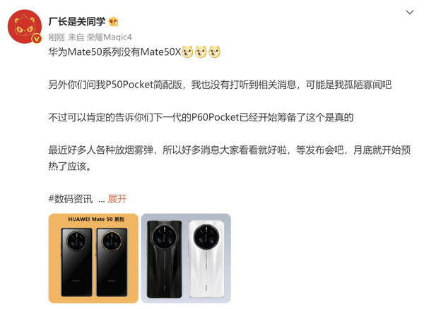 该博主称,华为Mate50系列没有Mate50X。与此同时,他还带来了关于华为其他手机的消息。这位博主表示,没有打听到P50 Pocket简配版的相关消息,但“不过可以肯定的告诉你们,下一代的P60 Pocket已经开始筹备了,这个是真的。”