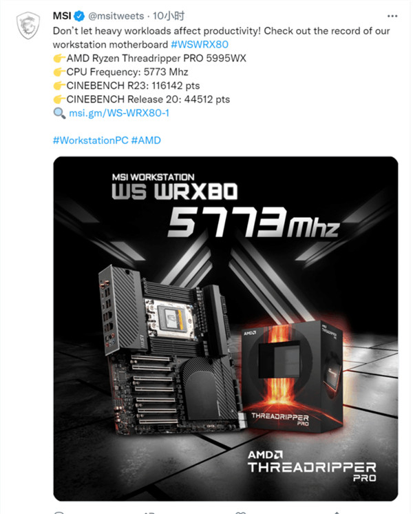 就在今天,知名主板厂商微星就在其官方推特预热其最新的WS WRX80 主板,其在推文中表示,WS WRX80 主板可将线程撕裂者 PRO 5995WX 超频至 5773MHz,Cinebench R23 跑分可以达到 116142,而R20 跑分更是可以达到 44512 分。