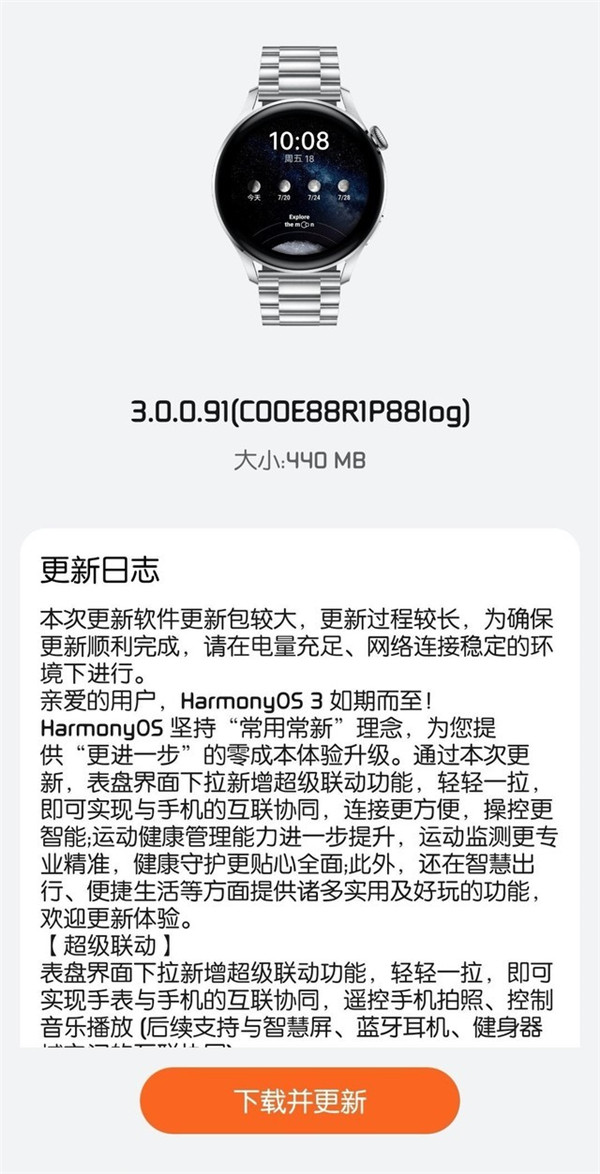 在超级联动方面,表盘界面下拉新增超级联动功能,轻轻一拉,即可实现手表与手机的互联协同,遥控手机拍照、控制音乐播放(后续支持与智慧屏、蓝牙耳机、健身器械之间的互联协同)。