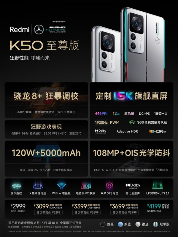 昨晚,Redmi K50至尊版正式发布,8+128版2999元,8+256版3099元,12+256版3399元,12+512版3699元,K50冠军版4199元。