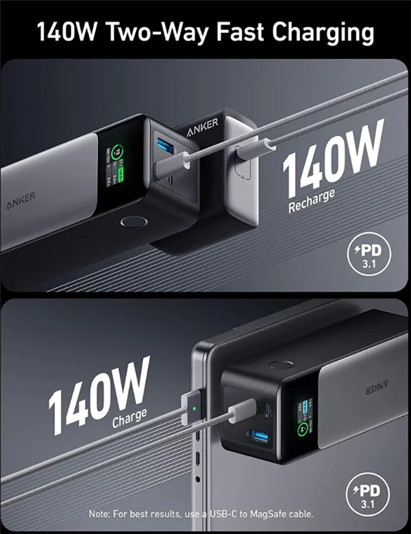 PowerCore 配备了新的 Power Delivery 3.1 规范,可以从单个 USB-C 端口输出超过以前最大 100W 的功率。 Anker 的新电池组可以从两个 USB-C 端口中的任何一个输出 140W 的功率,并且还有一个能够进行 18W 充电的 USB-A 端口。