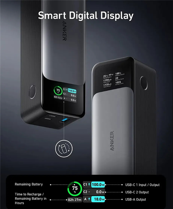 PowerCore 24K 的一个突出特点是它的智能显示屏,它可以显示每个连接设备的功耗、剩余的电量以及充电时间等信息。根据产品常见问题解答,屏幕确实消耗 0.36W 的功率,因此 Anker 建议在不使用时将其关闭。