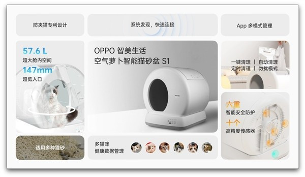 家里有小喵喵的家庭看过来!OPPO为爱猫人士打造了一款智能猫砂盆--OPPO空气萝卜智能猫砂盆S1。支持一键清理,自动清理,定时清理,勿扰模式这四种功能,让你随时随地可以掌握小猫咪的动向.此外,这款智能猫砂盆采用滚筒和集便仓一体的设计,这也是防夹猫的专利设计,保证家里毛孩子的安全!另外,这款猫砂盆有10个高精度传感器,提供57.6L空间,适用于多种猫砂,支持APP多模式管理!由此看来,这款猫砂盆为撸猫用户必备神器,在保证猫咪安全的同时,解放主人的双手,何乐而不为呢?首销立减300,到手仅需999元!