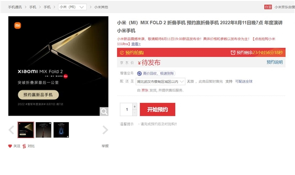 8月11日消息,小米MIX Fold 2将在今晚19点发布,目前该机已在小米京东自营旗舰店接受预约。
