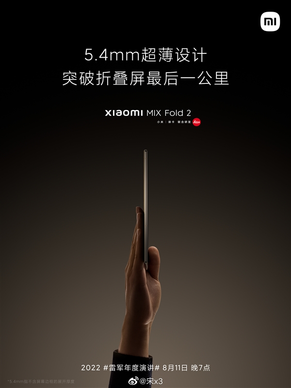 不仅如此,MIX Fold 2做到了超薄设计,机身厚度只有5.4mm。小米创办人雷军指出,这次MIX Fold 2使用了自研的微水滴形态转轴。