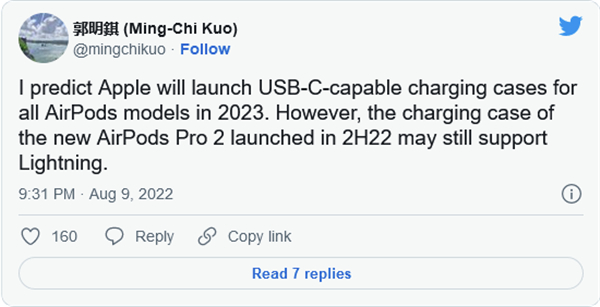 天风证券分析师郭明錤称,苹果第二代AirPods Pro可能仍然采用Lightning充电盒。在今天的推文中他预测苹果将等到2023年再为所有AirPods型号改用USB-C充电盒。新款AirPods Pro将于今年晚些时候发布。