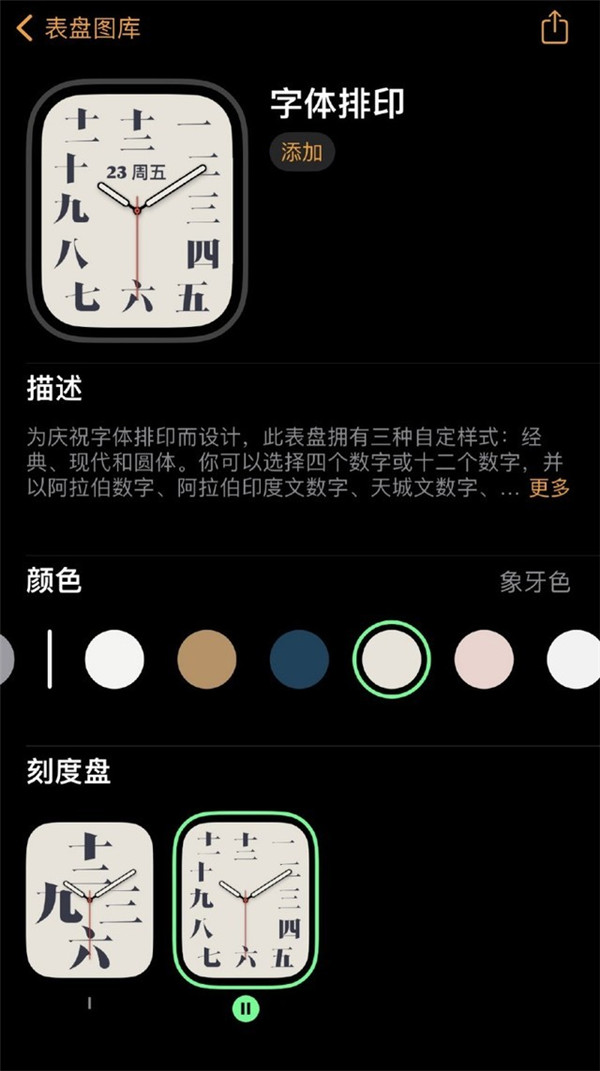 苹果官方称,这是为庆祝字体排印而设计,这款表盘拥有三个自定义样式,用户可以选择四个数字或十二个数字,还可以以阿拉伯数字、阿拉伯印度数字、天城文数字等显示,并且用户还可以随意选择底色。