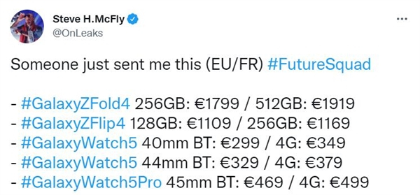 今天,爆料人Onleaks曝光了三星Galaxy Z Fold4价格。