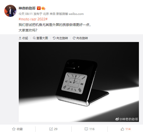 8 月 4 日消息,8 月 2 日的摩托罗拉 moto 新品发布会因故取消,目前新的发布会时间还没有公布,官方也在为其新机继续预热,今天联想中国区手机业务部总经理陈劲就展示了摩托罗拉 moto razr 2022 的真机实拍图。