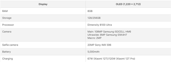 具体包括1220×2712分辨率OLED挖孔屏、联发科天玑8100芯片、8GB内存、1.08亿像素主摄+800万超广角+200万微距、2000万前摄、5000mAh电池、67W有线快充等。